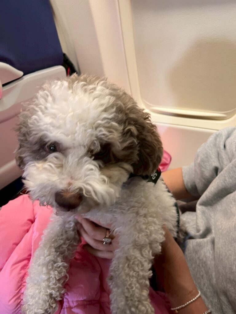 飛行機で隣にいたワンちゃんです♪ アメリカは膝の上にワンちゃんを乗せてもOKなんですね。